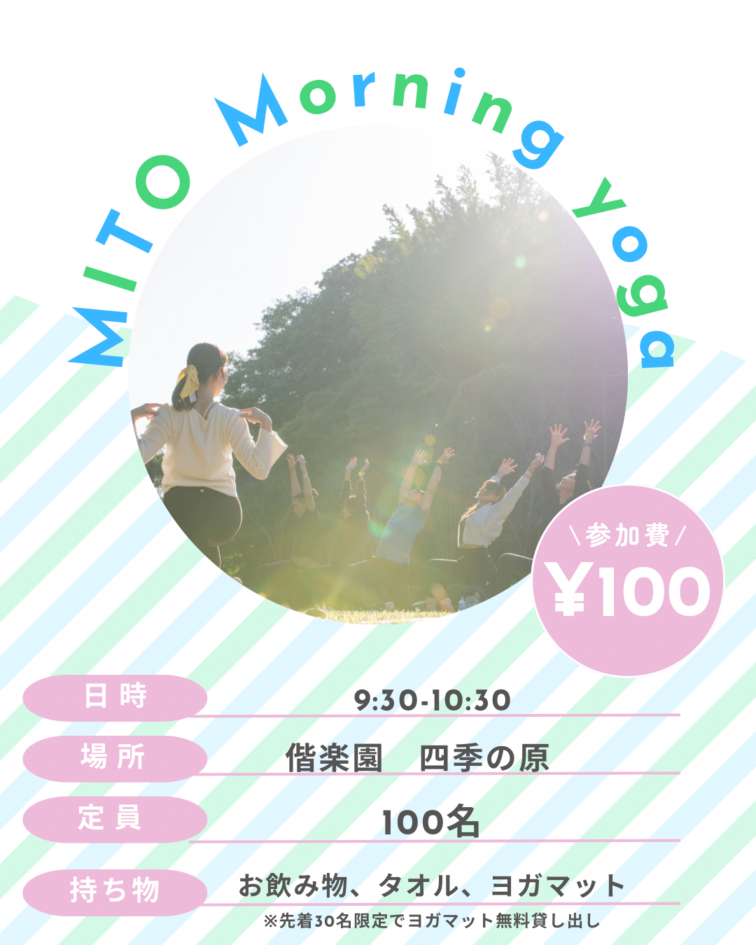 | 実施内容 | : | 水戸でヨガをまるっと楽しむ1日! 水戸の街がヨガでつながる特別な一日 そのオープニングを飾るのは、水戸が誇る広大なオアシス「偕楽園 広い空の下、みんなで動けば、ヨガはもっと楽しく、もっと自由に 見上げるほど広い空、足の裏に感じる芝生の感触、そして春のやわ スタジオの壁を飛び出して、自然の一部になるような心地よさを一 / ヨガが初めての方も、体が硬いと感じている方も大丈夫です。 水戸ヨガのインストラクターが、どなたでも心地よく動けるよう丁 |