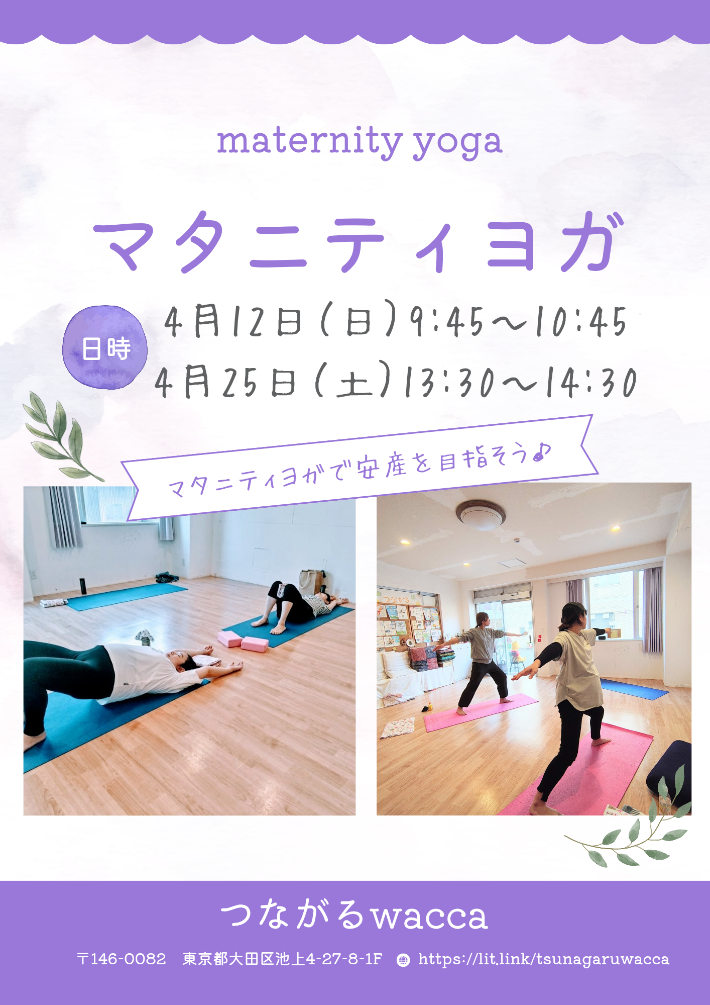 | 実施内容 | : | ストレッチやヨガポーズで心と身体をゆるめます。 妊娠中の不調や運動不足、出産・産後・育児に向けての体力作り、 マタニティヨガで安産を目指しましょう! 〔対象〕 |