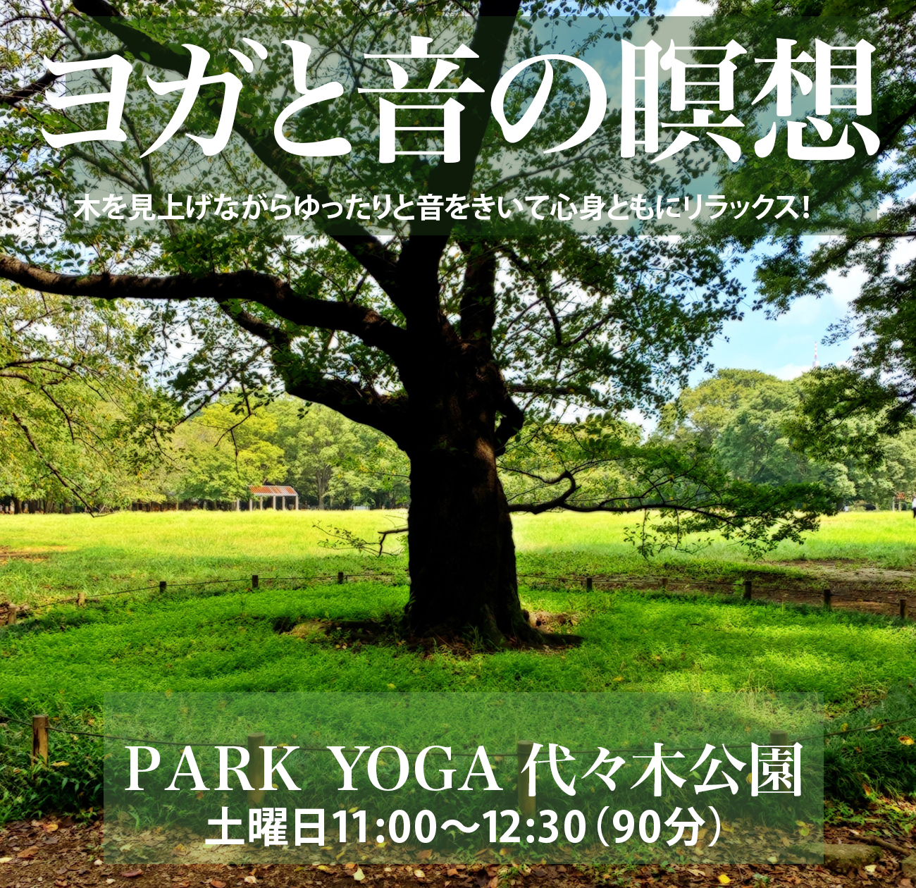 | イベント名 | : | PARK YOGA 代々木公園 音とヨガ瞑想 音を聴いてリラックス! |