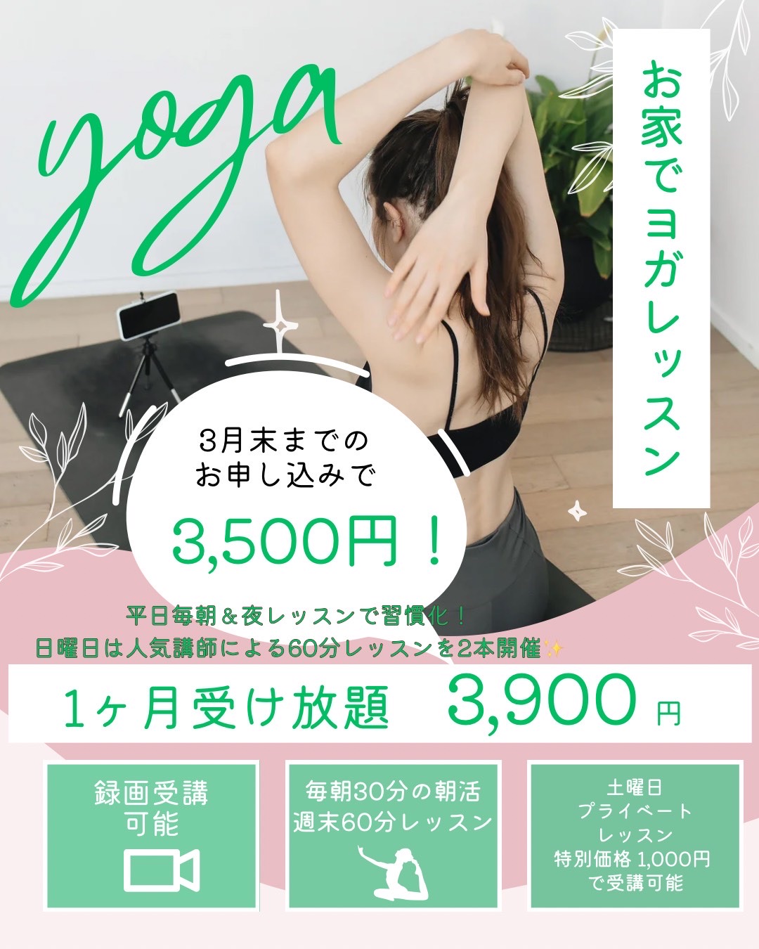 | 実施内容 | : | zoomを使用します 忙しい方でも続けやすいよう、アーカイブ受講も可能です。 【レッスンスケジュール】 私自身も受けたいと思うような内容になりました アーカイブ受講OK参加できない日も後からレッスンを受けられ 【参加者限定特典】 【料金】1ヶ月受け放題3,900円 朝ヨガの習慣を一緒に作りませんか? |