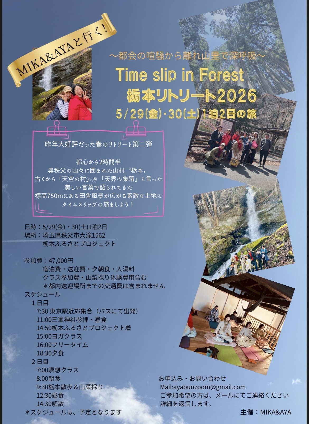 | 実施内容 | : | 〜都会の喧騒から離れ山里で深呼吸〜 ヨガと自然・由緒ある場所へ 日時:5/29(金)・30(土)1泊2日 スケジュール |