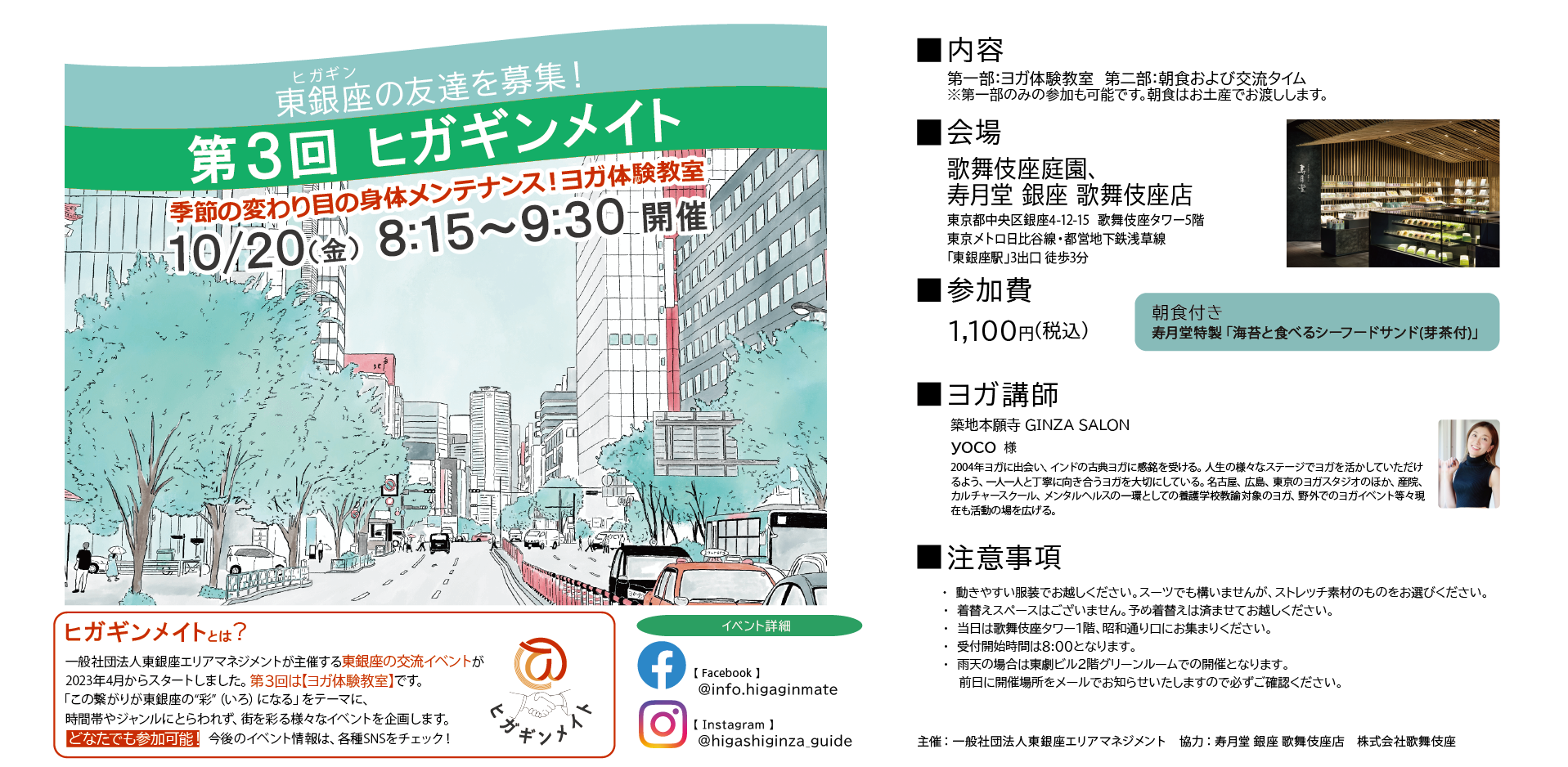 | 実施内容 | : | 一般社団法人東銀座エリアマネジメントは、東銀座エリアの在住者、在勤者でコミュニティを形成し、幅広い世代が交流し東銀座への理解を深めるためのイベント『ヒガギンメイト』を定期的に実施しております。今回は季節の変わり目の身体と心のメンテナンス、ヨガ体験教室を開催します。 内容:第一部:ヨガ体験教室(8:15~9:00予定) |
