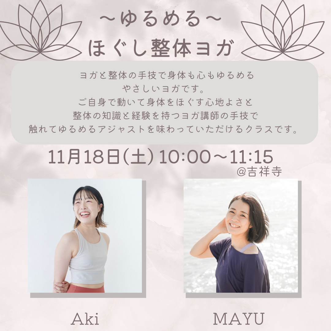 | 実施内容 | : | ヨガと整体の手技で身体も心もゆるめるやさしいヨガです。ご自身で動いて身体をほぐす心地よさと、整体の知識とを持つヨガ講師の手技で、触れてゆるめるアジャストを味わっていただけるクラスです。 チャイルドポーズでのおやすみ中やシャバアーサナ中に肩や背中、腰回りを触ってゆるめます。触られたくない箇所がある場合などは事前にお知らせください。 ※講師プロフィール※ 赤ちゃんと一緒のヨガ〜シニア世代まで幅広い年代やライフスタイルの人にヨガを伝えている。2015年に第一子出産後より特に、ヘルシーでナチュラルな暮らしを意識したライフスタイルを送っている。そういったライフスタイルへのファンも多く、日々のレッスンと合わせて東洋医学をベースとした「健康的な暮らし(WELLNESS LIFE)」のライフスタイルアドバイザー としての側面も持つ。 Aki ヨガというとキラキラしたイメージで、かつ身体が柔らかくない自分には無縁と思っていました。しかし友人の勧めで受けたクラスでの身体と呼吸が解放される感覚がとても気持ちよく、そこからヨガを続けています。 現在は会社員をしつつ整体の学校にも通い学びを深めています。ヨガでも整体でも大切にしているのは、人と比べる必要はなくお一人お一人に合う形は違うということです。クラス中は整体の経験を活かしてお身体に触れる時間も取りながら、身体を動かした後の気持ちよさを感じていただけたらと思います。 |