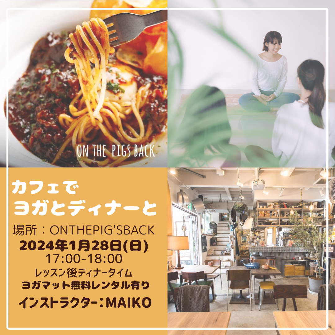 | 実施内容 | : | 以前カフェヨガでお世話になっていた ヨガで体を動かしてから レッスン終わりの1杯ご一緒しませんか? アクセス:辻堂東海岸バス停徒歩約1分/浜見山バス停徒歩約7分/JR辻堂駅南口徒歩約20分 料金:1500円+ディナー代(お選び頂くメニューにより異なります) 持ち物:レッスン時に必要なお飲み物/動きやすい格好 ★ヨガマットは無料レンタルがございます ★16:45受付開始となりますので ◎どなたでもご参加可能です。 そしてPIG’Sはわんちゃんのいるカフェです。 犬や動物好きな方、 インストラクター: MAIKO |