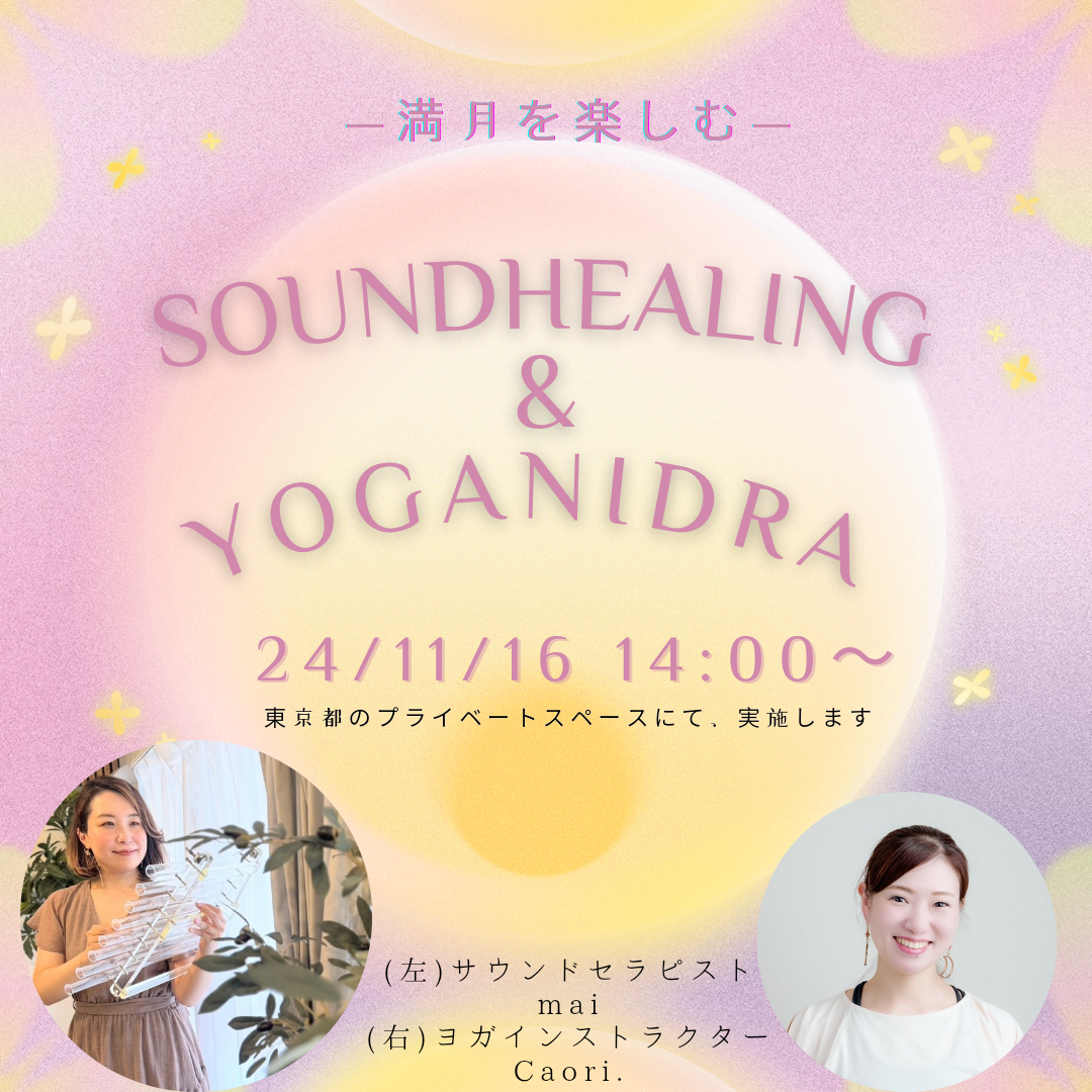 | 実施内容 | : | 満月の日を、心地よく過ごします 皆で月礼拝をして身体を整えてから、 ヨガの時間中、SoundTherapist;mai によるクリスタルハープの生演奏が絶えず注がれ、身体、こころ、そして魂までも健やかな状態に導かれるような、高次な時間を過ごします。 癒やしのひと時を、ご一緒しましょう…!