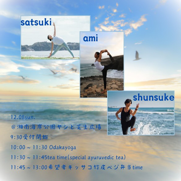 | 実施内容 | : | 海目の前の公園で、まずOdaka yogaで背骨にスペースと、マインドに余白を取り戻します♡その後はAyurvedic teaで温まりオーガニックショップKISSAKO lab&pantryさん@kissakolabandpantryの竹皮ベジ弁当を一緒に大空の下で食べ満たされます。 ※雨荒天の場合近くの市民の家に変更 |