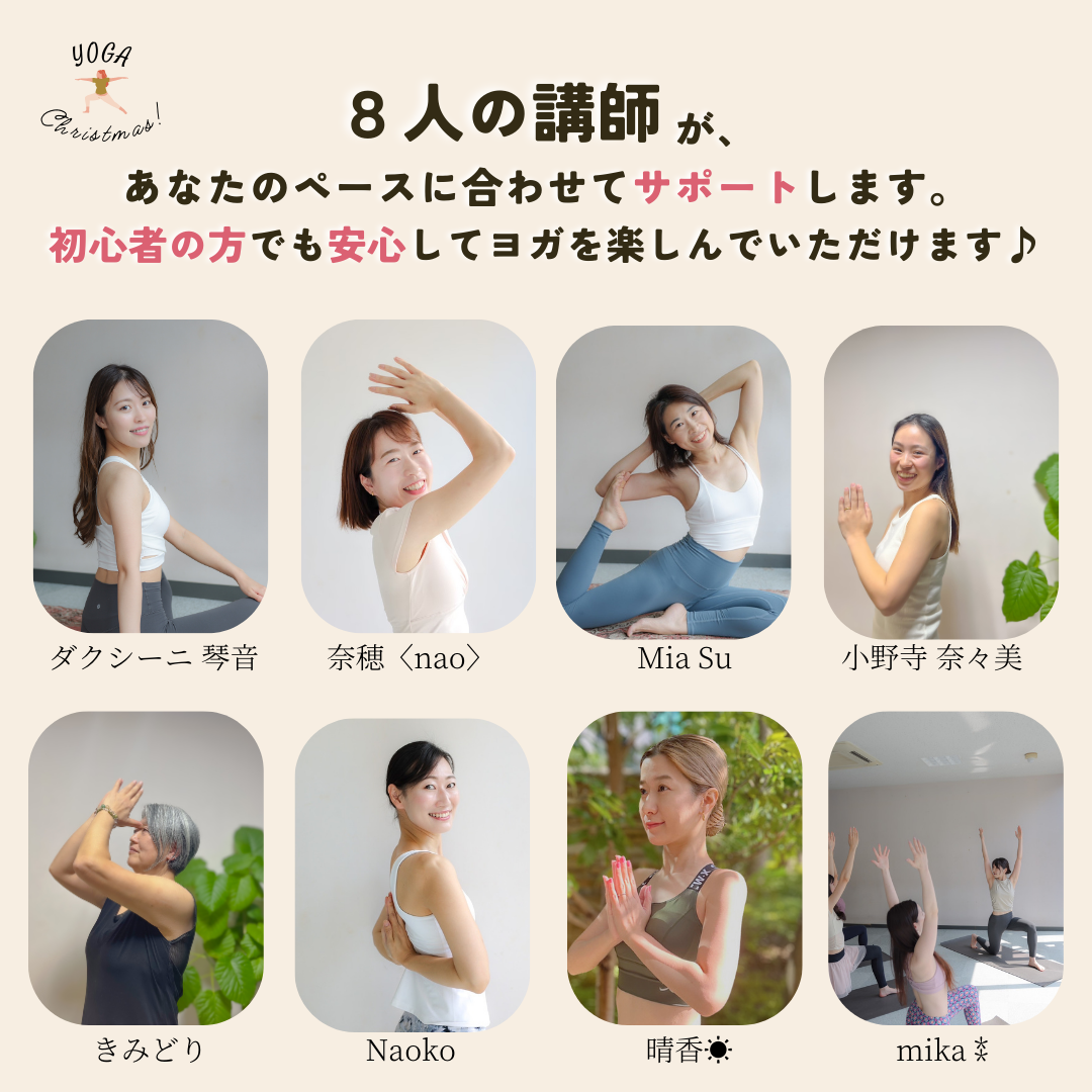 | 実施内容 | : | 『クリスマスクッキー&紅茶つき♪』『ヨガ初心者さんにおすすめ』 ☑︎日々の疲れ/ストレスが溜まっている人 日々の疲れが溜まった心身を呼吸をしながらほぐしていきます。 少人数制で丁寧にサポート!初心者の方でも安心して参加できるリラックスヨガイベントです。個性溢れる8人の講師が皆さんを温かくお迎えし、一人一人をしっかりサポートしていきます。 ご家族でも参加していただけます♪ 【スケジュール】 【ティータイム】 【持ち物】 【服装】 【キャンセルポリシー】 |