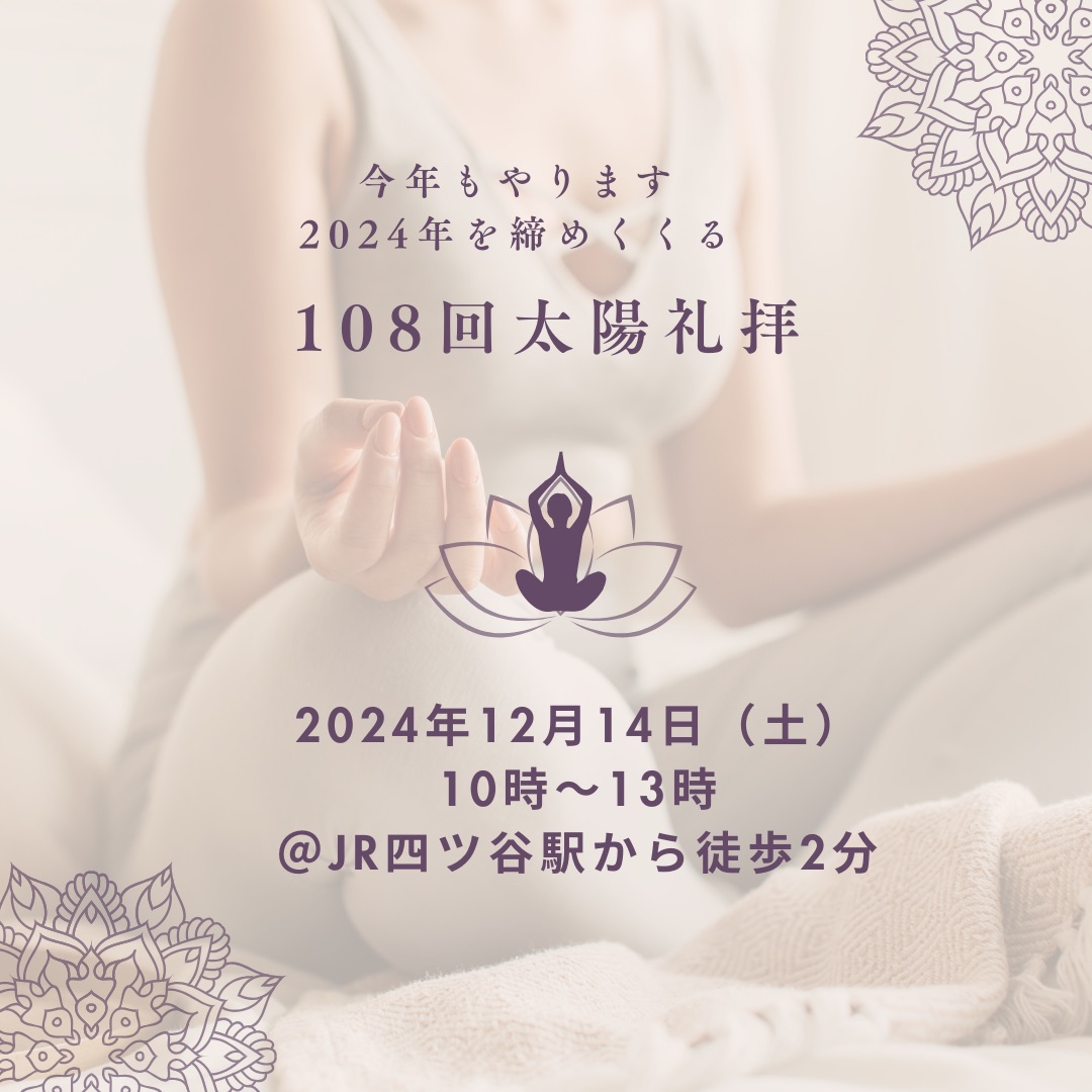 | 実施内容 | : | 〜108回太陽礼拝2024〜 ▽日時:12月14日(土) ▽場所:四谷スポーツスクエア ▽定員:12名 ▽参加費2,500円 ▽持ち物 |