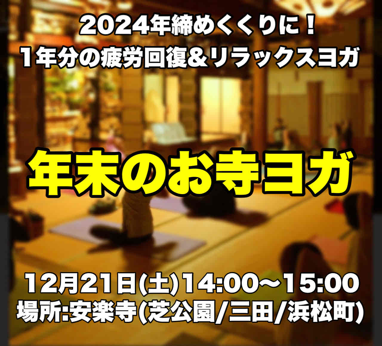 | イベント名 | : | 【年末のお寺ヨガ】2024年締めくくりに! 1年分の疲労回復&リラックスヨガ |