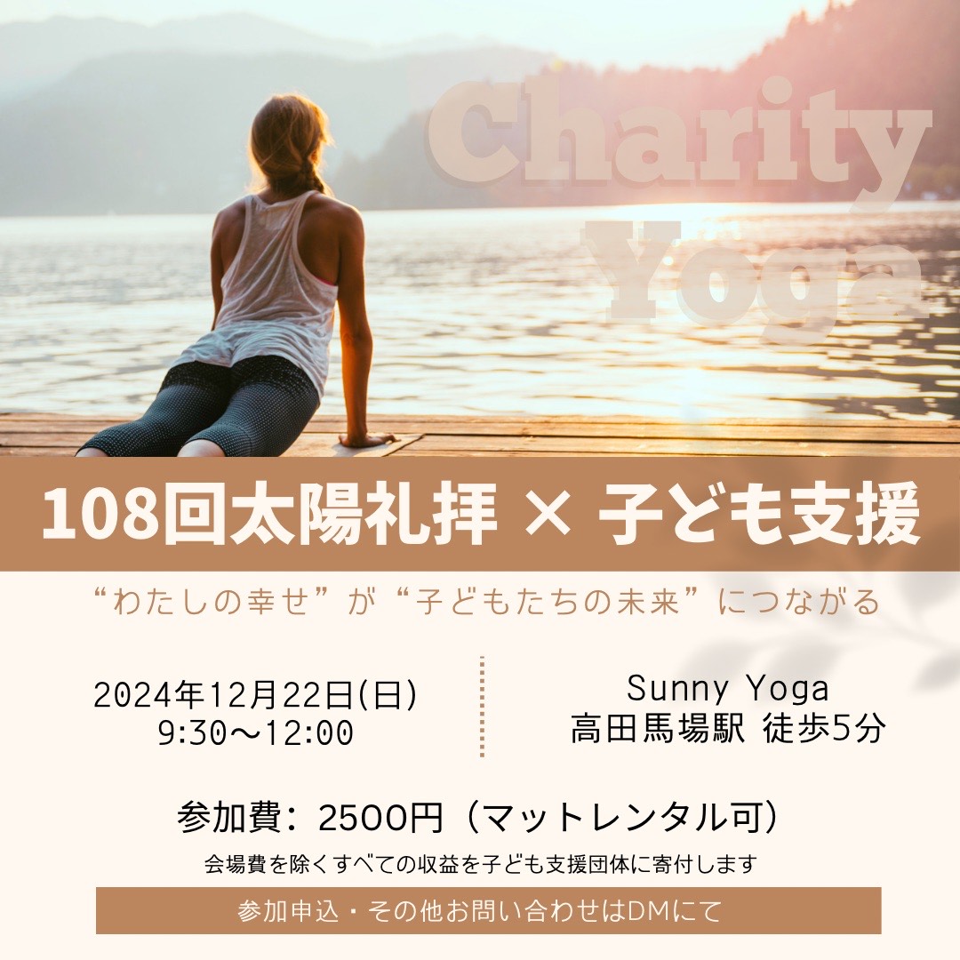 | 実施内容 | : | ヨギーの年末といえば、108回太陽礼拝。 会場費を除く、全ての収益が地域の子ども支援団体に寄付されるチャリティーヨガクラスです。 全国5ヶ所で同時開催。太陽礼拝開始前と終了後に各会場をzoomでつなぎます。(北海道2箇所、神奈川、大阪、東京。こちらのイベントは東京会場です) 今年で6回目となるこちらの企画。東京会場は今年から参加させていただくことになりました。 【“わたしの喜び”が“子どもたちの未来”に繋がる】 休みながらでも、途中まででも、もちろん最後まで頑張っても、なんでもいいです。一緒に愉しい時間と空間を共有しましょう。 ご参加お待ちしております。 Aya |
