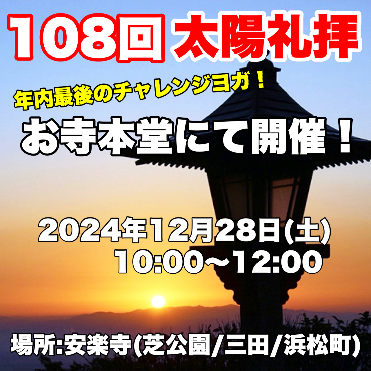 | 実施内容 | : | 一年の締めくくりに煩悩の数だけ太陽礼拝をして、新年をスッキリした気持ちで迎えましょう! *お着替えできるスペースございます。 【持ち物】 |