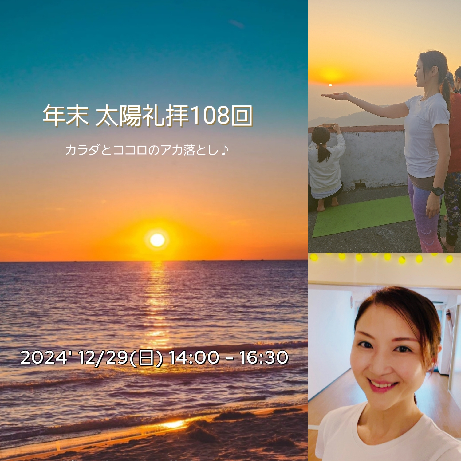 | イベント名 | : | 『年末 太陽礼拝108回』 vol.9 ” カラダとココロ のアカ落とし クリヤーな年末年始を迎えましょう♪ ” |