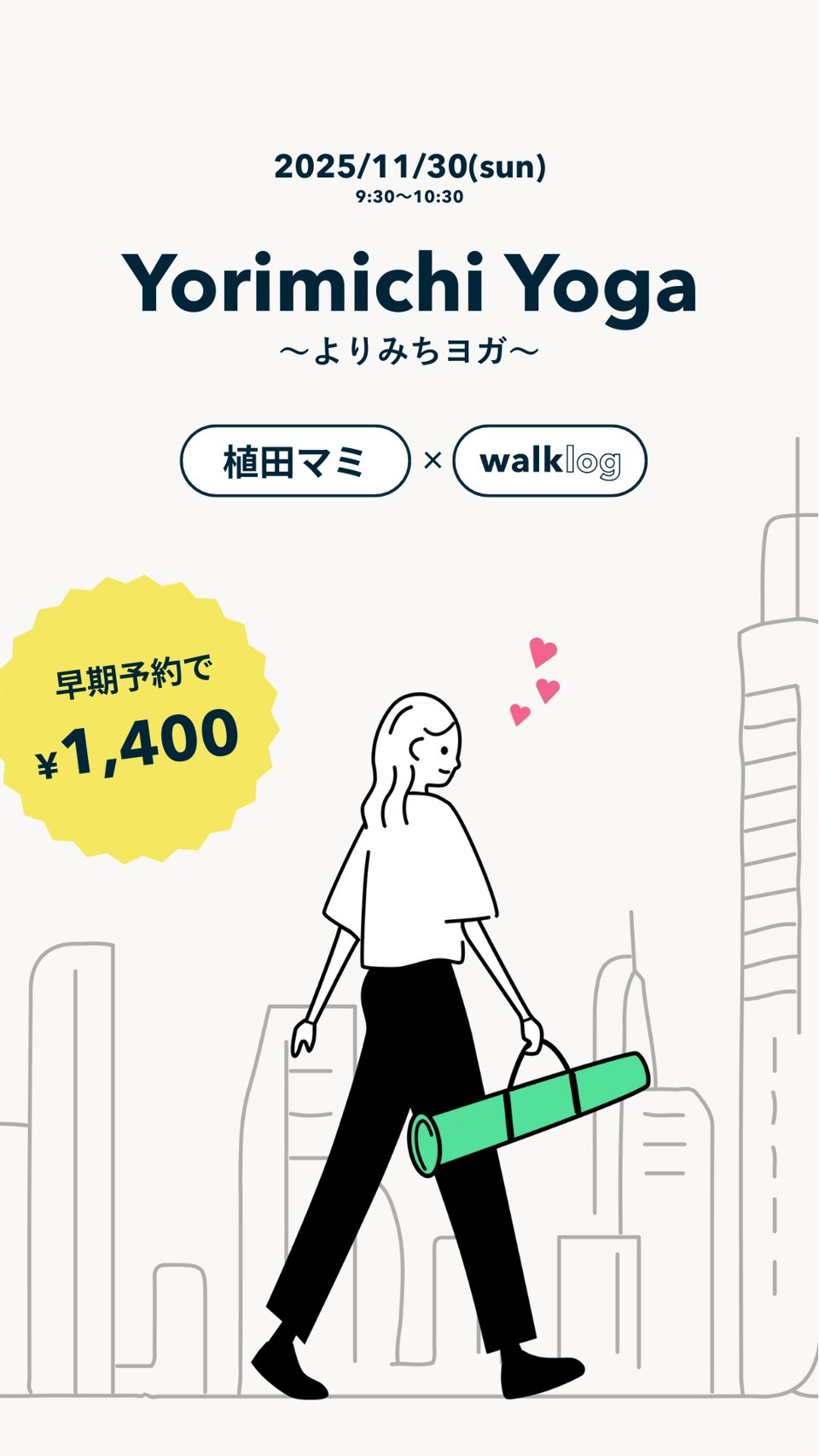 | 実施内容 | : | よりみちYogaとは渋谷発のベンチャー企業であるwalklog* が毎月開催する、walklog × Yoga の体験イベントです。 イベントでは、walklogのオフィシャルユーザーであるヨガ講師の方々と一緒にヨガを体験したのち、「好きなモノ、おすすめのモノ」をwalklog で見つける体験を提供予定です。 現在walklogは社会実験中のサービスのため、本イベントに参加いただいた方限定で、開発中のサービスを体験いただけます。 ◎イベント詳細 ◎ スケジュール 【お持ち物】